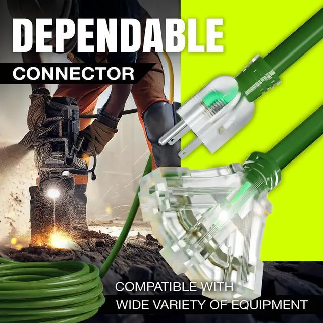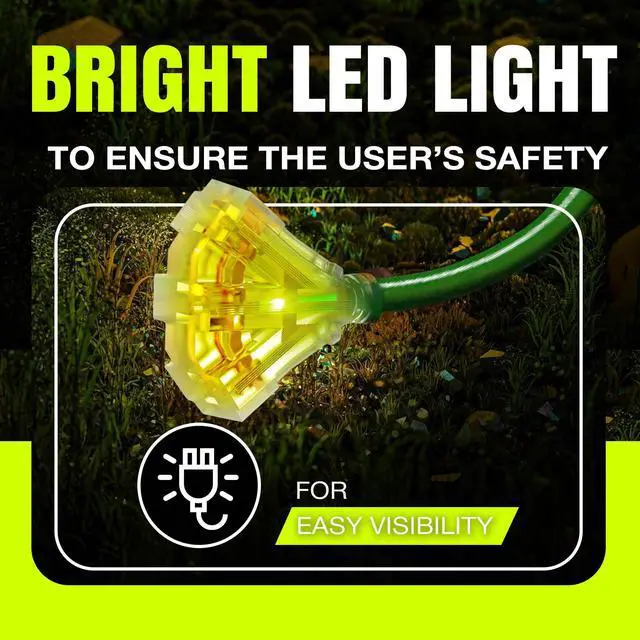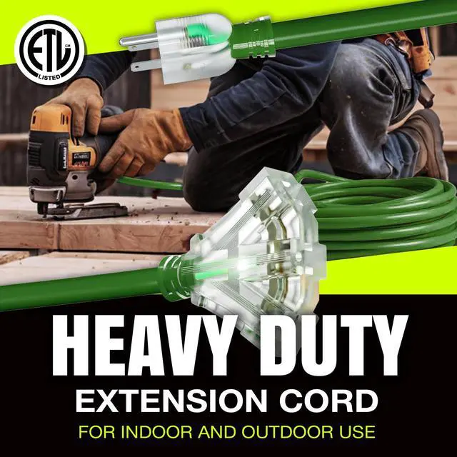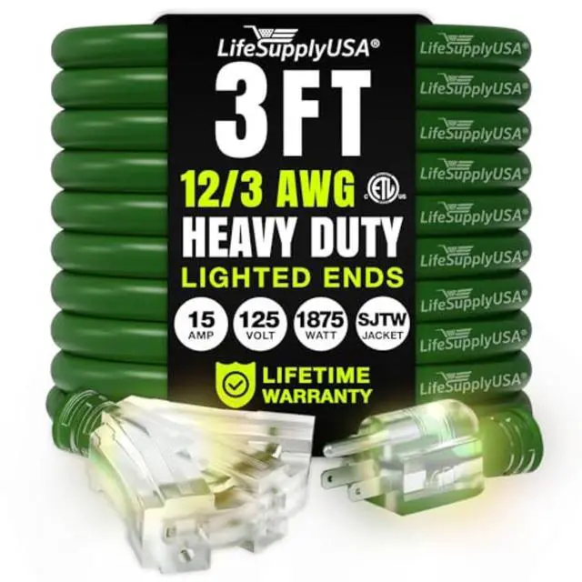 Durable Performance Rely on the LifeSupplyUSA Heavy Duty Outdoor Extension Cord for unmatched durability and reliability, whether at home, work, or on a construction site. Engineered to perform in harsh conditions, this indoor & outdoor heavy duty extension cord 3 prong model withstands extreme temperatures and features a waterproof design, ensuring it lasts through any challenge. Built with a robust vinyl jacket, the three prong extension cord resists oil, grease, moisture, and abrasion, protecting against electrical hazards and wear. The durable construction of the power cord extension not only ensures safe operation across diverse environments but also contributes to the cord's longevity, making it a dependable choice for any task. Outdoor Electric Cord with Enhanced Visibility The lighted end of the indoor & outdoor electrical cord indicates power while the brightly colored PVC jacket improves visibility, minimizing tripping hazards in busy or dimly lit areas. This feature enhances safety and makes the electric cord extension easily identifiable among other tools, preventing accidental disconnections and ensuring smooth operation. Versatile and Powerful Electric Cords From powering heavy-duty equipment like drills and saws to lighting up your holiday decorations, LifeSupplyUSA Indoor & Outdoor Extension Cords are versatile enough to handle it all. Whether tackling major construction jobs, home renovations, or casual outdoor setups, this outdoor waterproof extension cord adapts seamlessly to your needs. Certified for Optimal Performance This 10 ft,12 Gauge, 3-Outlet SJTW waterproof outdoor extension cord is ETL listed, meeting North American safety standards. Supporting 15 AMPs, 125 Volts, and up to 1875 Watts, the heavy duty drop cord extension power cord is designed for extra safety and robust performance, capable of powering high-demand equipment with ease and reliability.