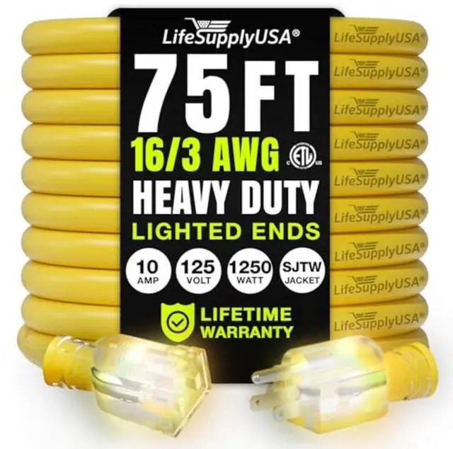 Durable Performance Rely on the LifeSupplyUSA Heavy Duty Outdoor Extension Cord for unmatched durability and reliability, whether at home, work, or on a construction site. Engineered to perform in harsh conditions, this indoor & outdoor heavy duty extension cord 3 prong model withstands extreme temperatures and features a waterproof design, ensuring it lasts through any challenge. Built with a robust vinyl jacket, the three prong extension cord resists oil, grease, moisture, and abrasion, protecting against electrical hazards and wear. The durable construction of the power cord extension not only ensures safe operation across diverse environments but also contributes to the cord's longevity, making it a dependable choice for any task. Outdoor Electric Cord with Enhanced Visibility The lighted end of the indoor & outdoor electrical cord indicates power while the brightly colored PVC jacket improves visibility, minimizing tripping hazards in busy or dimly lit areas. This feature enhances safety and makes the electric cord extension easily identifiable among other tools, preventing accidental disconnections and ensuring smooth operation. Versatile and Powerful Electric Cords From powering heavy-duty equipment like drills and saws to lighting up your holiday decorations, LifeSupplyUSA Indoor & Outdoor Extension Cords are versatile enough to handle it all. Whether tackling major construction jobs, home renovations, or casual outdoor setups, this outdoor waterproof extension cord adapts seamlessly to your needs. Certified for Optimal Performance This 75 ft,16 Gauge, 3 Prong SJTW waterproof outdoor extension cord is ETL listed, meeting North American safety standards. Supporting 10 AMPs, 125 Volts, and up to 1250 Watts, the heavy duty drop cord extension power cord is designed for extra safety and robust performance, capable of powering high-demand equipment with ease and reliability.