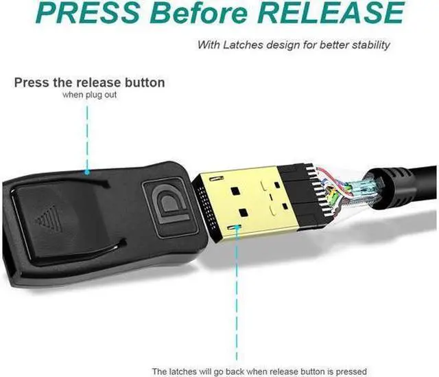 DisplayPort connector with latches provides a secure connection with a release button that must be depressed before unplugging