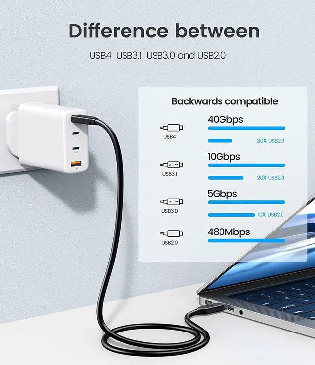 - USB4 Data Cable: The USB 4 cable only uses the USB Type-C connector. With a maximum speed of 40Gb (20Gbps x 2) and simultaneous DisplayPort video and audio transfer, it also supports USB 2.0, USB3.0, USB3.1 GEN 1, USB 3.2 GEN 2 and Thunderbolt 3.