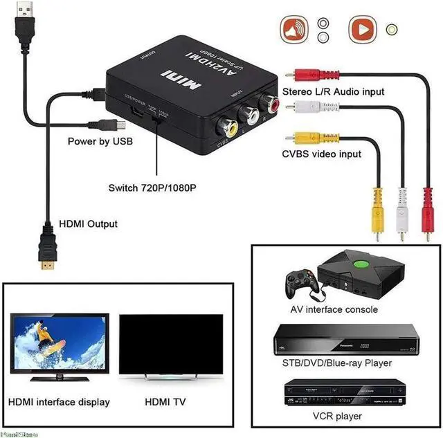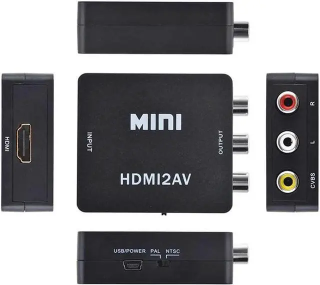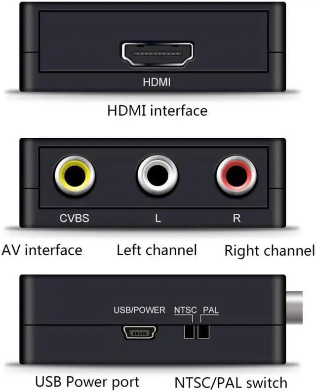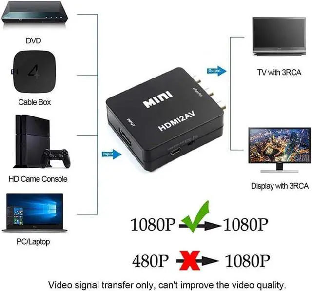 and right channel (L/R)Features: No need to install drivers, it is easy to portable, flexible, plug and play. HDMI to RCA Converter, HDMI to AV Adapter, 1080P HDMI to 3RCA AV CVBs Composite Audio Viedo PAL/ NTSC Converter Adapter for PC Laptop Xbox PS4 PS3 TV STB VHS VCR Camera DVD etc. The Converter convert HDMI to RCA AV composite signal (from yellow, red, white cables) signal works on a smart HDTV / HD monitor / HD projector, Upscale to 720P / 1080P. Supports PAL, NTSC 3.58, NTSC 4.43, SECAM, PAL/M, PAL/N standard TV formats input. Supports for PS3/ STB/ XBOX/ VHS/ TV/ PC/ DVD Player/ VCR Camcorder/ Game Console.