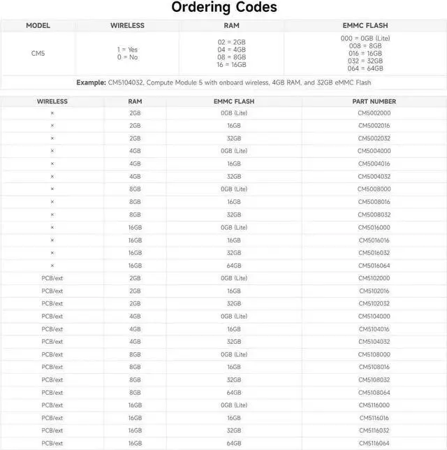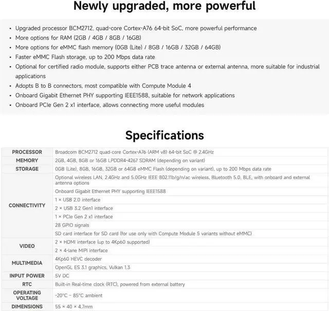 Upgraded processor BCM2712, quad-core Cortex-A76 64-bit SoC, more powerful performance More options for RAM (2GB / 4GB / 8GB / 16GB) More options for eMMC Flash (0GB (Lite) / 8GB / 16GB / 32GB / 64GB)