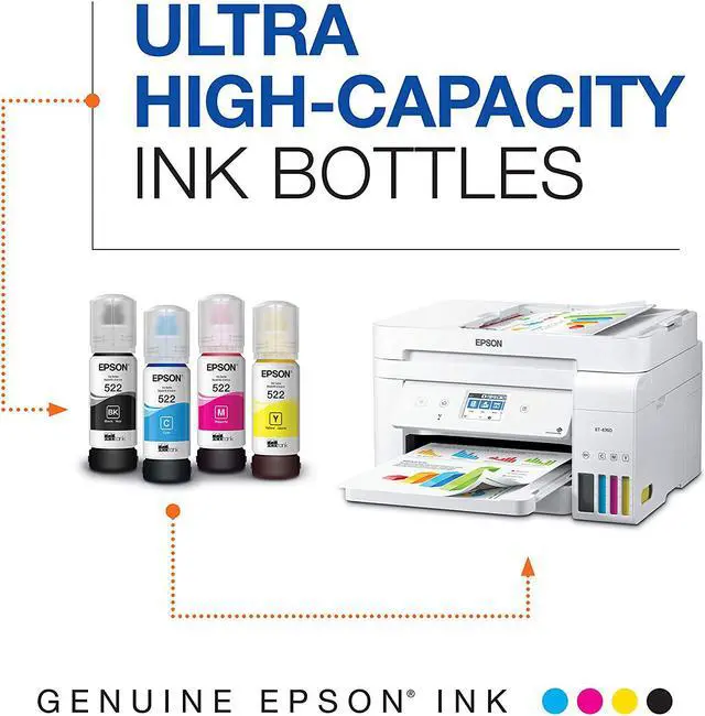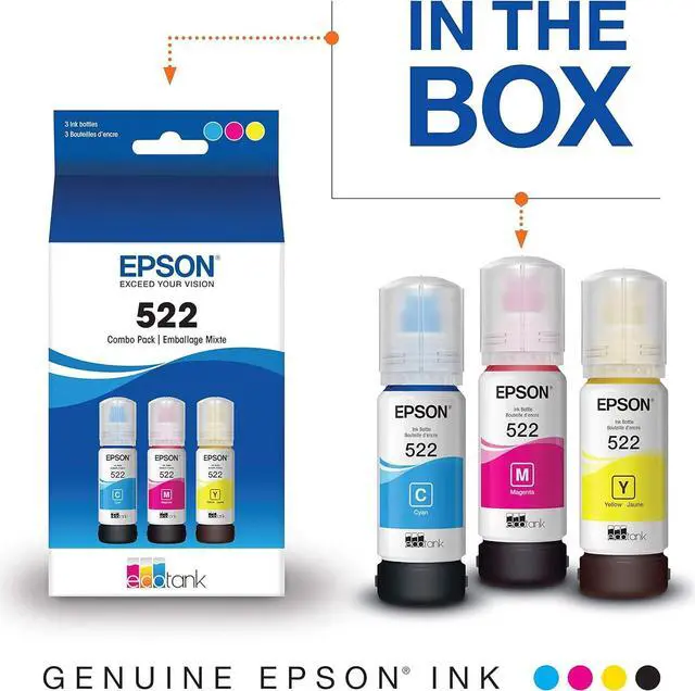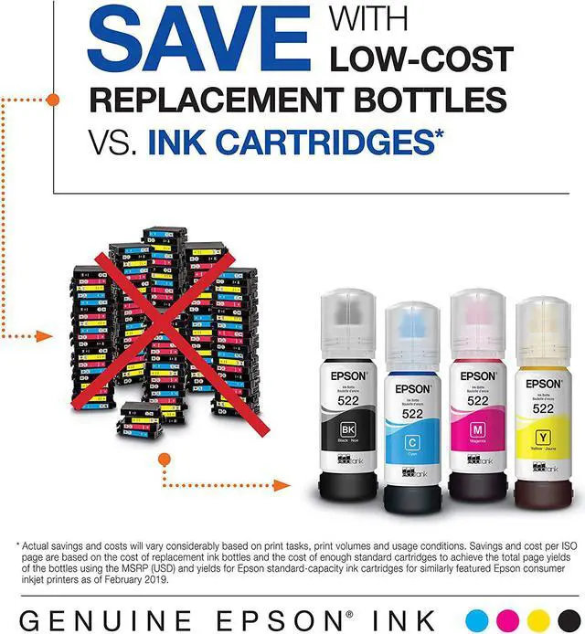 Epsons EcoTank replacement ink bottles deliver thousands of pages, plus genuine Epson quality. Save up to 90 percent on ink with low-cost replacement ink bottles vs. ink cartridges. Plus, exclusive, uniquely keyed EcoFit bottles make it easy to fill each colour tank.