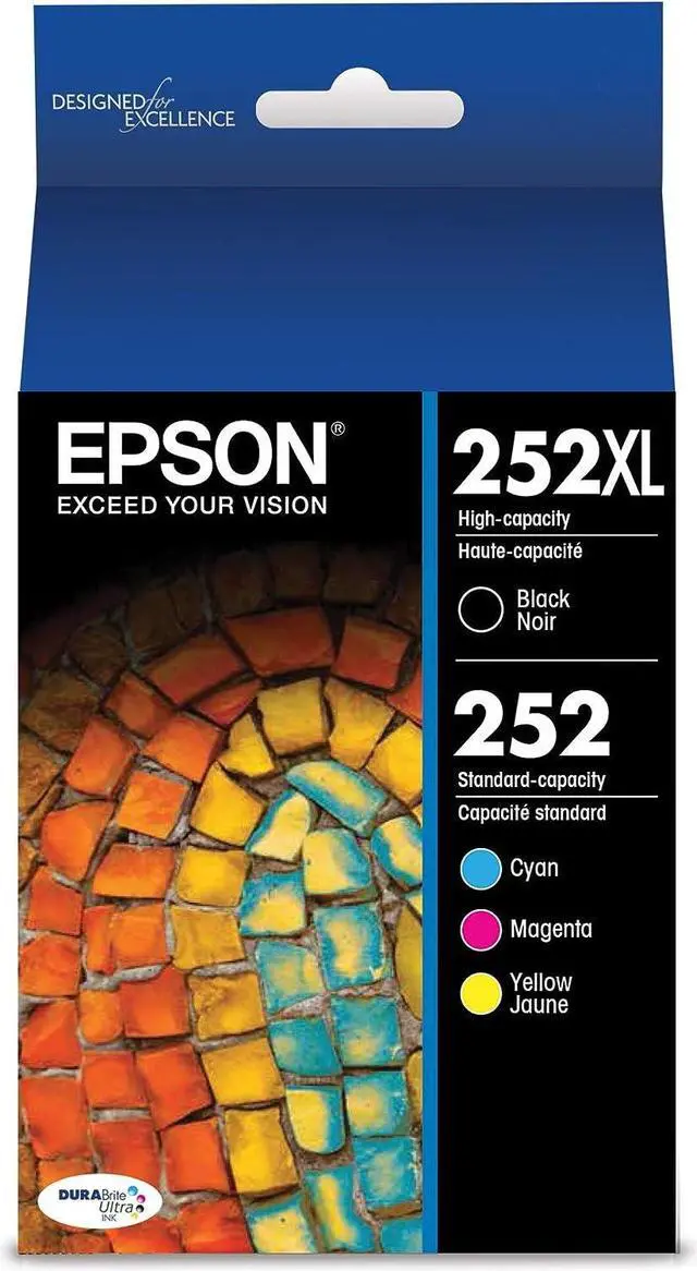 EPSON DURABrite Ultra 252XL/252 high Yield black and standard color C/M/Y ink cartridges (T252XL-BCS), Combo 4/pack is fast-drying, long-lasting ink delivers vivid, true-to-life photos and laser-sharp text.