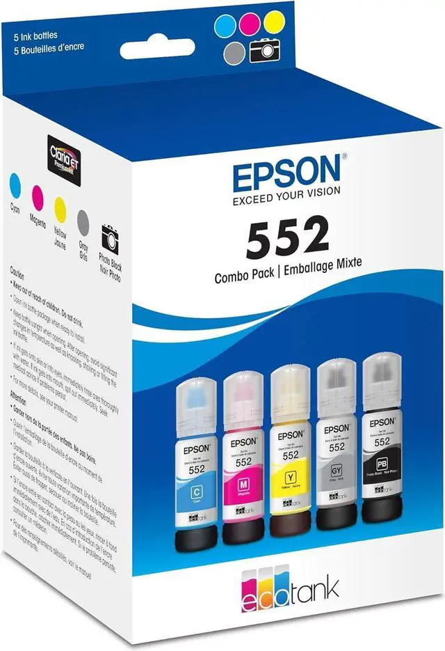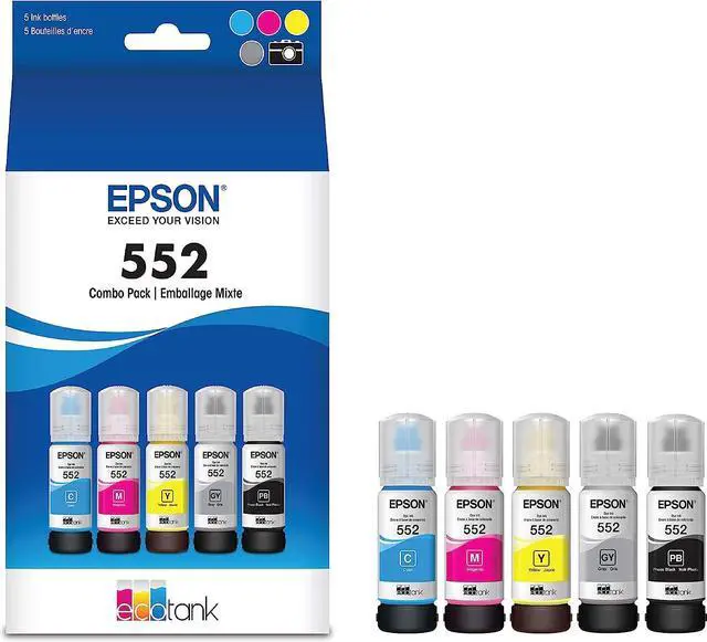 Designed for EcoTank® Photo supertank printers, this high-capacity 6-colour ink set offers Claria ET Premium Inks for smooth gradations and accurate colour reproductions. Featuring dye-based Cyan, Magenta, Yellow, Gray and Photo Black ink, it also includes a pigment Black for crisp, sharp black text. Available in 70 mL bottles