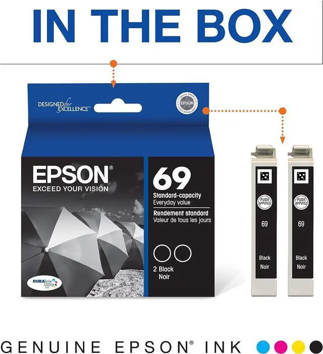 Epson's revolutionary DURABrite Ultra ink produces smudge, fade and water resistant prints that look brilliant on both plain and glossy photo paper. This package contains 2 Black cartridges that are compatible with the following EPSON printers and all-in-ones: Stylus CX5000, CX5000v, CX6000, CX7000F, CX7400, CX7450, CX8400, CX9400Fax, CX9475Fax, N10, N11, NX100, NX105, NX110, NX115, NX200, NX215, NX300, NX305, NX400, NX415, NX510, NX515; workforce 30, workforce 40, workforce 310, workforce 315, workforce 500, workforce 600, workforce 610, workforce 615, workforce 1100.