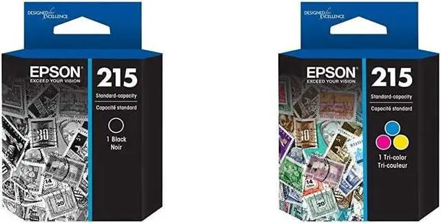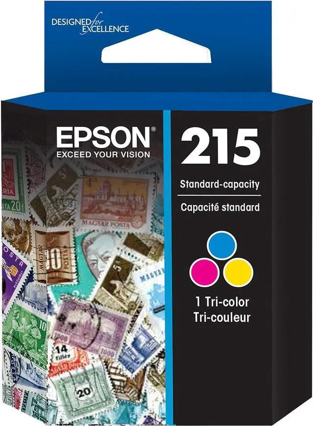 T215 Standard-capacity Black Ink Cartridge Epson pigment ink delivers laser-quality sharp text and bright, vivid colours for all your everyday, plain paper prints. Prints are fade- and water-resistant, so they're sure to last. Plus, this instant-drying ink means you can share prints with clients and co-workers immediately after printing. Device Types: Inkjet Printer; Colour(s): Black; Supply Type: Ink; Market Indicator (Cartridge Number): 215.T215 Standard-capacity Tri-Colour Ink Cartridge Epson pigment ink delivers laser-quality sharp text and bright, vivid colours for all your everyday, plain paper prints. Prints are fade- and water-resistant, so they're sure to last. Plus, this instant-drying ink means you can share prints with clients and co-workers immediately after printing. Device Types: Inkjet Printer; Colour(s): Tri-Colour; Supply Type: Ink; Market Indicator (Cartridge Number): 215.