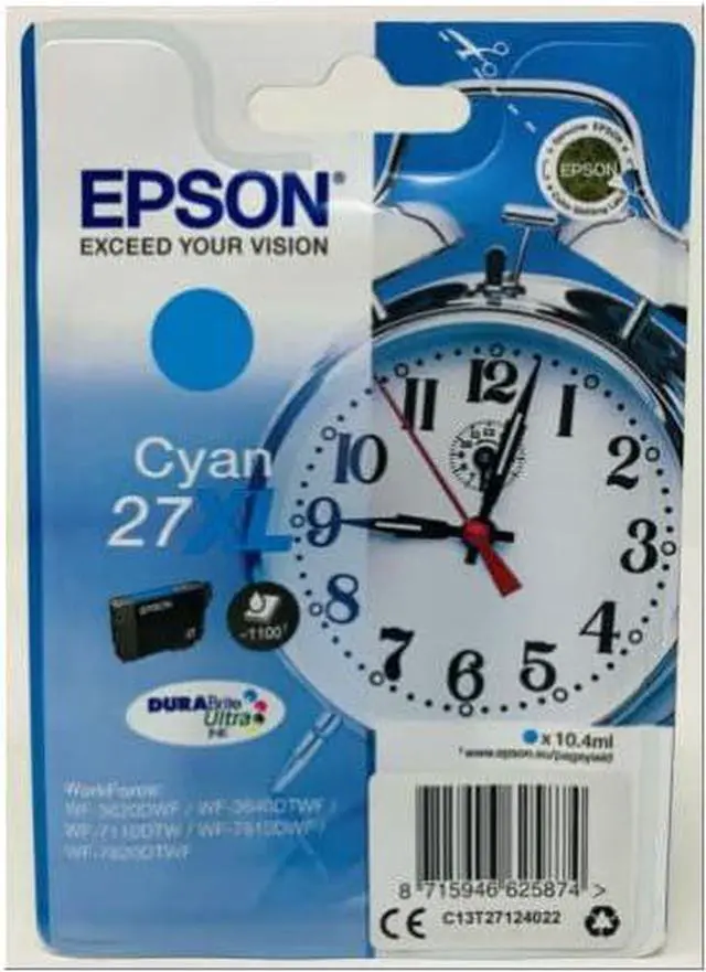 Singlepack Cyan 27XL DURABrite Ultra ink produces business quality text documents with every expression and laboratory quality photos that not only look good, but are also smudge-proof, waterproof and non-fading.