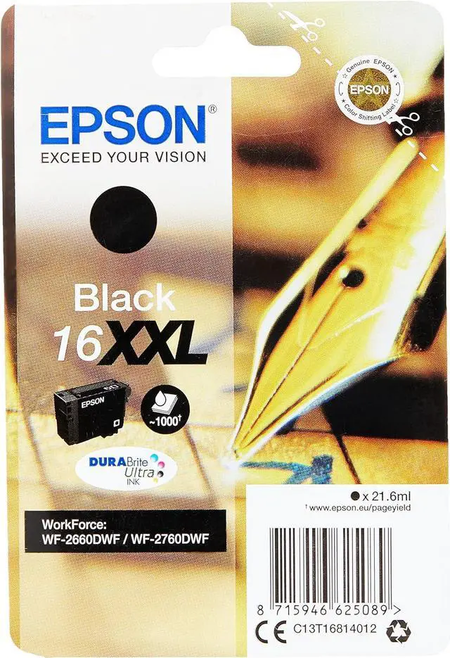 With Epsons individual inks, you only replace the color used, saving you up to 30% ink1 compared to competitors tri-color cartridges. Epson 16XXL Black Ink Cartridge has 1000 page yield and is compatible with WorkForce WF-2760DWF, and WF-2660DWF.