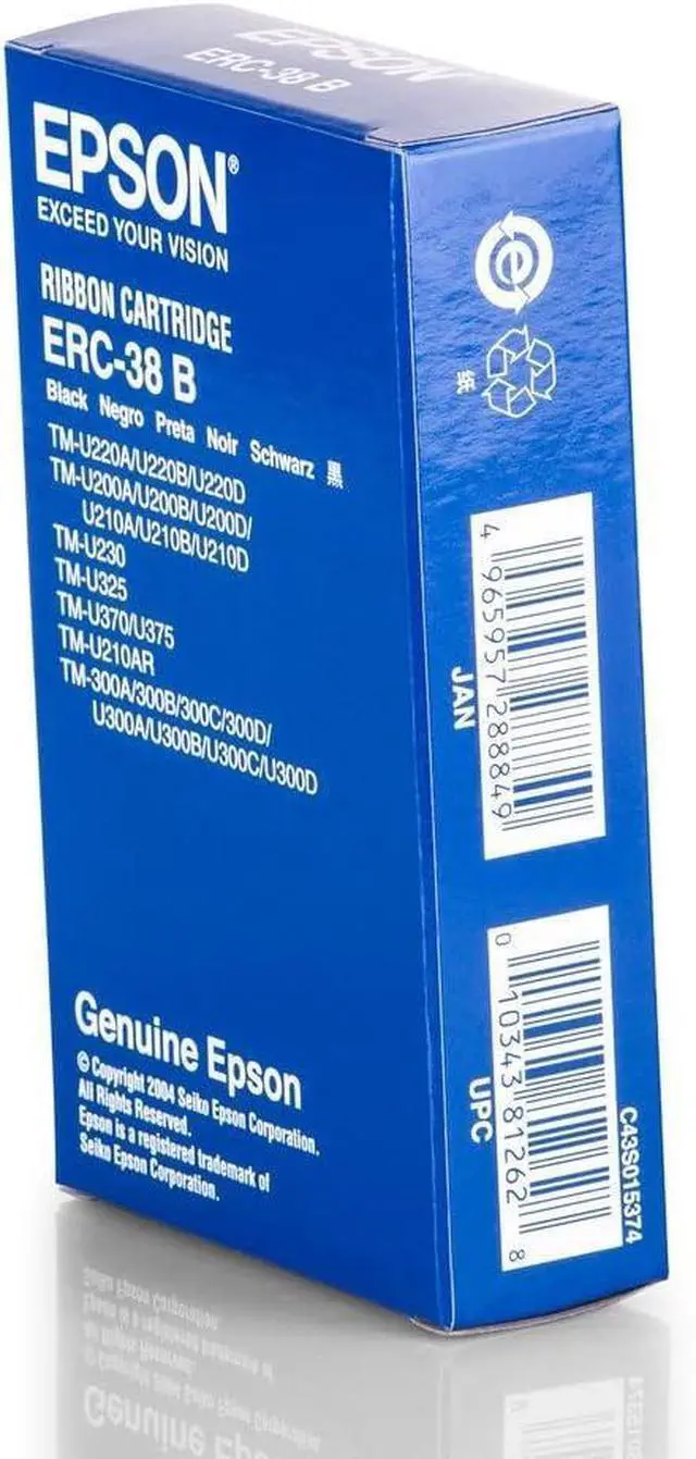 General Information Brand Name: Epson Manufacturer Part Number: ERC-38B Manufacturer Website Address: //www.epson.com Manufacturer: Epson Corporation Marketing Information: Fabric ribbon is designed for use with Epson TM-U200A, TM-U200B, TM-U200D, TM-300A, TM-300C, TM-300D, TM-U370 and TM-U375. Ribbon yields 3,000,000 characters. Package Contents: 1 x Ribbon Package Type: Retail Packaged Quantity: 1 Each Product Name: Black Cartridge Product Type: Ribbon Cartridge Miscellaneous Assembly Required: No Compatibility: Epson printers: TM-U200A TM-U200D TM-300A TM-U200B TM-300C TM-300D TM-U370 IT-U375 TM-U200A TM-U200B IT-U375 Country of Origin: China Limited Warranty: 1 Month Package Contents: 1 x Ribbon Post-consumer-waste%: 0% Recycled Content: 0% Recycled: No Product Information Compatibility: Epson printers: TM-U200A TM-U200D TM-300A TM-U200B TM-300C TM-300D TM-U370 IT-U375 TM-U200A TM-U200B IT-U375 Package Type: Retail Packaged Quantity: 1 Each Print Technology: Dot Matrix Technical Information Compatibility: Epson printers: TM-U200A TM-U200D TM-300A TM-U200B TM-300C TM-300D TM-U370 IT-U375 TM-U200A TM-U200B IT-U375 Print Color: Black Print Technology: Dot Matrix Typical Print Yield: 3000000 Character Warranty Limited Warranty: 1 Month