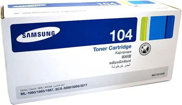 Samsung MLT-D104S (SU750A) Black Original Toner Cartridge. Compatible with the following Samsung printers: Samsung ML-1660, ML-1665, ML-1665W, ML-1675, ML-1860, ML-1865W, SCX-3200, SCX-3205, SCX-3205W. SU750A cartridge(s) average yield: 1500 pages. Colour: black. Shop Samsung Toner Cartridges at great prices to offer unprecedented print innovations and performance for your business.