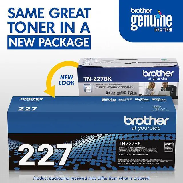 Brother Genuine TN-227BK High Yield Black Toner Cartridges deliver consistent, crisp, professional laser print quality with an up to 3,000-page yield. Brother Genuine toner is intelligently engineered to work seamlessly with your Brother printer to produce superior quality results that withstand the test of time. Use only Brother Genuine toner cartridges for reliable results. Brother offers an environmentally responsible way for customers to dispose of Brother Genuine cartridges at end of life. Visit the manufacturer's website for more information. For use with Brother printer and all-in-one models: HL-L3210CW, HL-L3230CDW, HL-L3270CDW, HL-L3290CDW, MFC-L3710CW, MFC-L3750CDW and MFC-L3770CDW.
