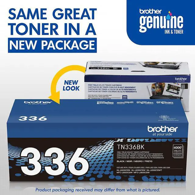 Brother Genuine TN-336BK includes 1 cartridge black toner. TN336BK provides high-quality, rich, vivid laserjet prints that you can rely on for up to 4000 pages/cartridge.*