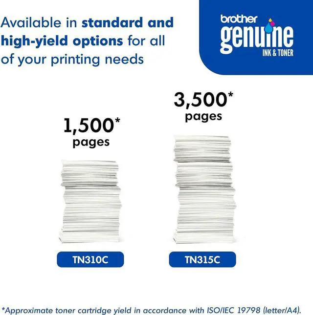 The Brother Genuine TN-315C replacement high-yield cyan toner cartridge can print approximately 3,500 pages(1). Brother is dedicated to being environmentally responsible and offers disposal programs for properly discarding its cartridges.