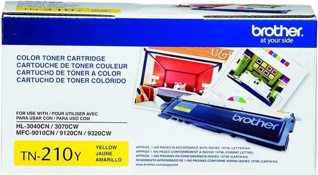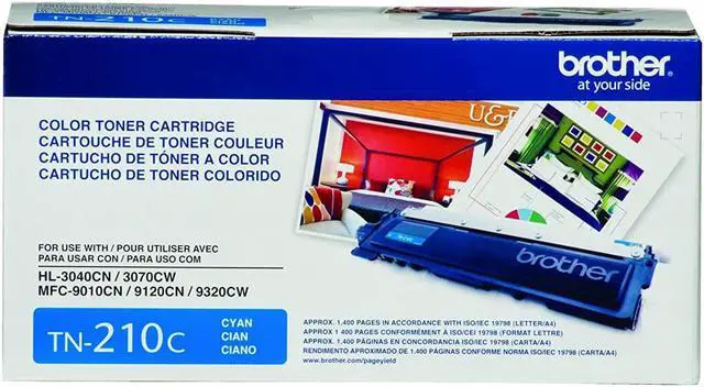 Includes TN210BK black, TN210C cyan, TN210M magenta and TN210Y yellow. Black cartridge yields approx. 2200 pages; colors approx. 1400 pages. Works with Brother HL-3040CN, HL-3070CW, HL-3075CW, MFC-9010CN, MFC-9120CN, MFC-9320CW, MFC-9325CW printers.