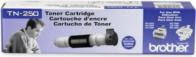 Brother's TN250 is a black laser toner cartridge for plain-paper fax machines and multifunction devices that's easy to install and produces great looking documents. It's compatible with Brother IntelliFax 2800, 2900, 3800, and MFC 4800 and 6800. It offers a print yield 2,200 pages (at 5% coverage).