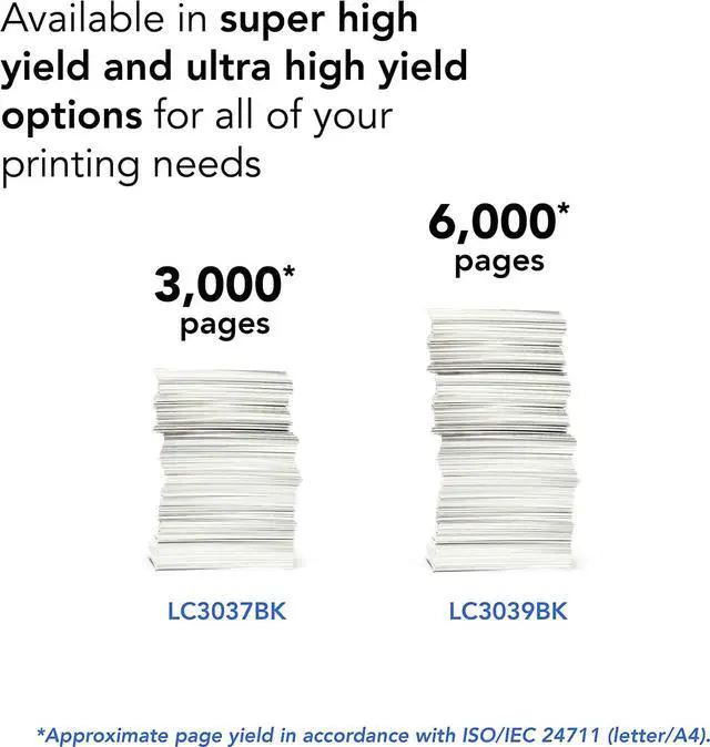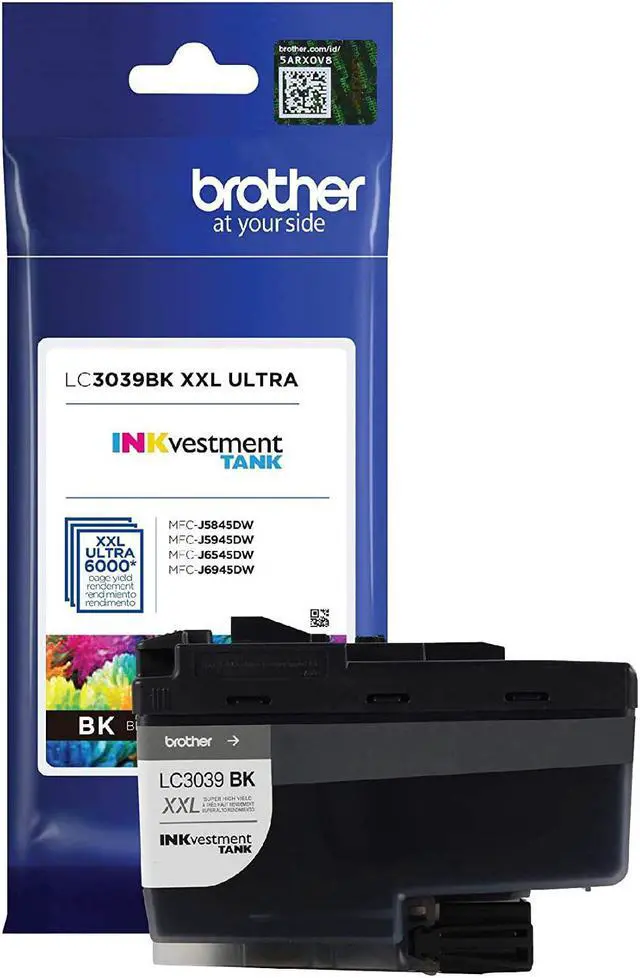 Brother Genuine LC3039BK Single Pack Ultra High-yield Black Investment Tank Ink Cartridges deliver consistent, crisp, professional inkjet print quality with an up to 6, 000-page yield. (1) Brother Genuine ink is intelligently engineered to work seamlessly with your Brother inkjet printer for optimum results delivering superior high-quality results that withstand the test of time. The LC3039BK is also an Dash Replenishment eligible replacement cartridge. Upon Activation, Dash Replenishmenteligible Brother printers will seamlessly order Brother Genuine supplies through your account and ship them directly to your door. Brother Genuine ink helps ensure reliable operation and protection of your inkjet printer and its long-life print heads and extensive testing ensures optimum performance. Using non-Brother Genuine inks may result in reduced page yield, inferior image quality and a messy experience. Brother Genuine ink is designed and formulated to work with Brother inkjet printers for optimal results. Use only Brother Genuine ink cartridges for reliable results. Product may not cover damage or malfunction caused by using non-Brother ink cartridges. Brother Genuine ink cartridges come in a variety of page yields to help save money and deliver more pages. Choices for Investment Tank inkjet printer include Super High-yield and Ultra High-yield options. Always check that the ink cartridge is compatible with your Brother inkjet printer model. Brother offers an environmentally responsible way to dispose of Brother Genuine cartridges at end of life. Visit manufacturers website for more information. Use Brother Genuine LC-3039BK Single Pack Ultra High-yield Black Investment Tank Ink Cartridges with Brother Investment Tank printer models: MFCJ5845DW, MFCJ5845DW XL, MFCJ5945DW, MFCJ6545DW, MFCJ6545DW XL and MFCJ6945DW that feature Brother Investment Tank technology providing exceptional features, an internal ink tank for super convenience and large page yields. Brother Investment Tank models include a two-year limited with free online, call, or live chat support for the life of the printer. (1) Approximate page yield in accordance with ISO/IEC 24711.