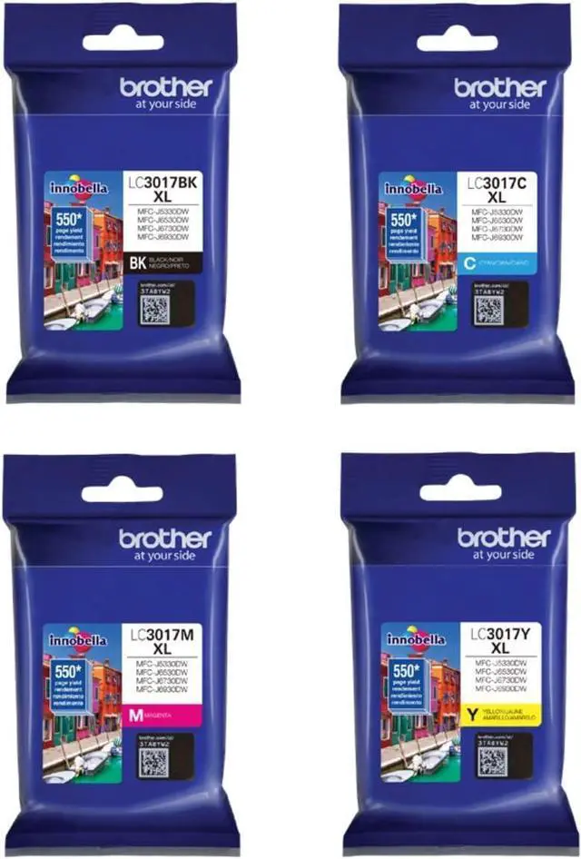 The Genuine Brother LC3017 (LC-3017) (BK/C/M/Y) High Yield Color Ink 4-Pack (Includes 1 each LC3017BK, LC3017C, LC3017M, LC3017Y). Each ink cartridge works with the following Brother models: Brother MFC-J5330DW, J6530DW, J6930DW. Each ink has a yield of 550 pages.