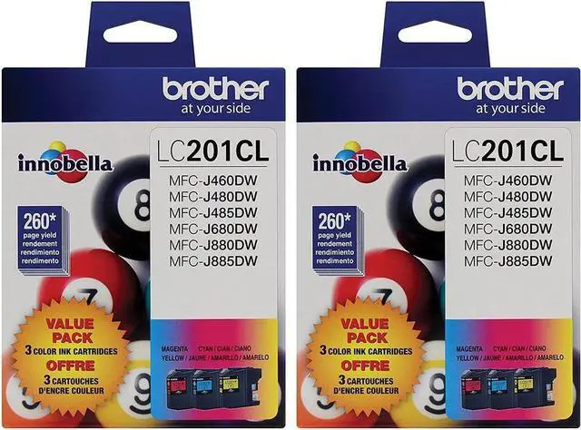 The LC201 C/M/Y combo 2 pack includes (2) Cyan, (2) Magenta, ansd (2) Yellow inks. These inks works with the following Brother models: MFC-J460DW, MFC-J480DW, MFC-J485DW, MFC-J680DW, MFC-J880DW, MFC-J885DW. Each ink has a yield of 260 pages.