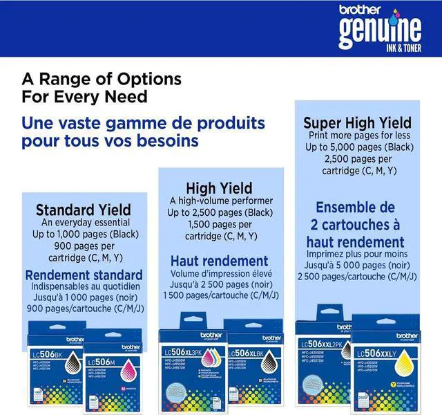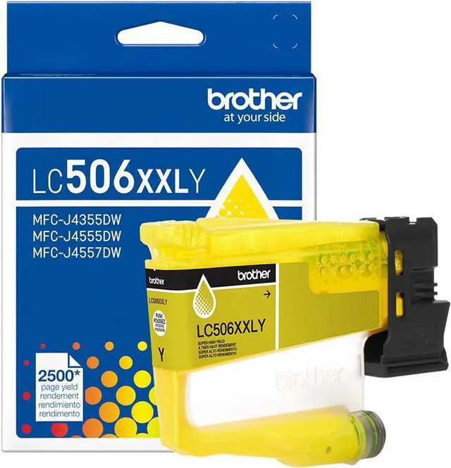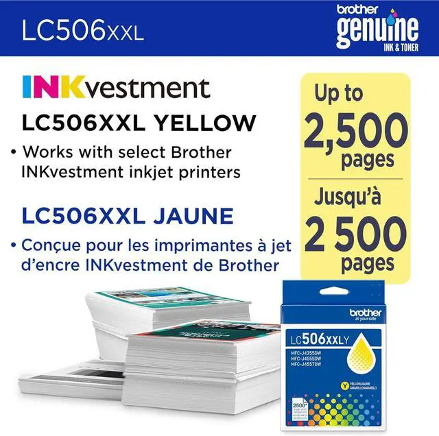 From airline tickets to business presentations, trust Brother Genuine Ink for consistent, premium performance with your Brother printer. Our highest yield LC506 series ink cartridges, LC506XXLYS Super High Yield Yellow Ink produces vibrant, sharp prints with rich colour for up to 2,500 pages.(1) The only brand we recommend, use it with Brother INKvestment MFC-J4355DW and MFC-J4555DW printers.