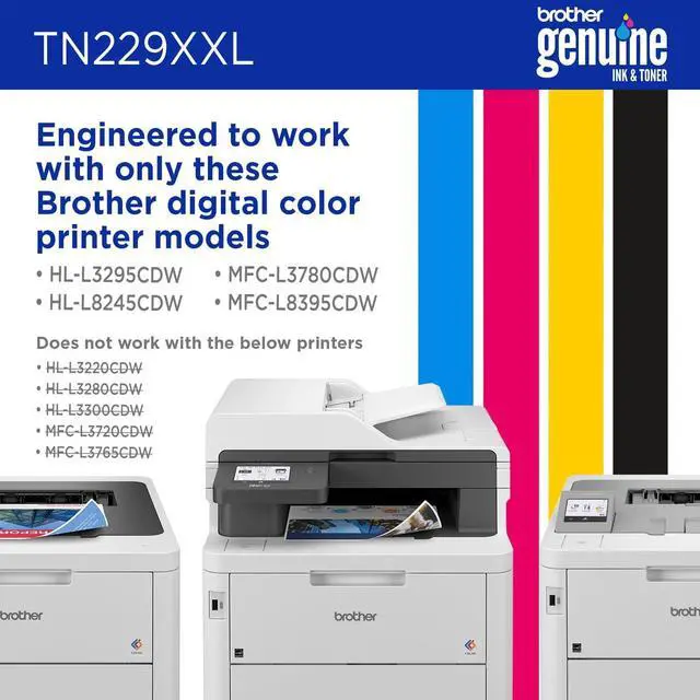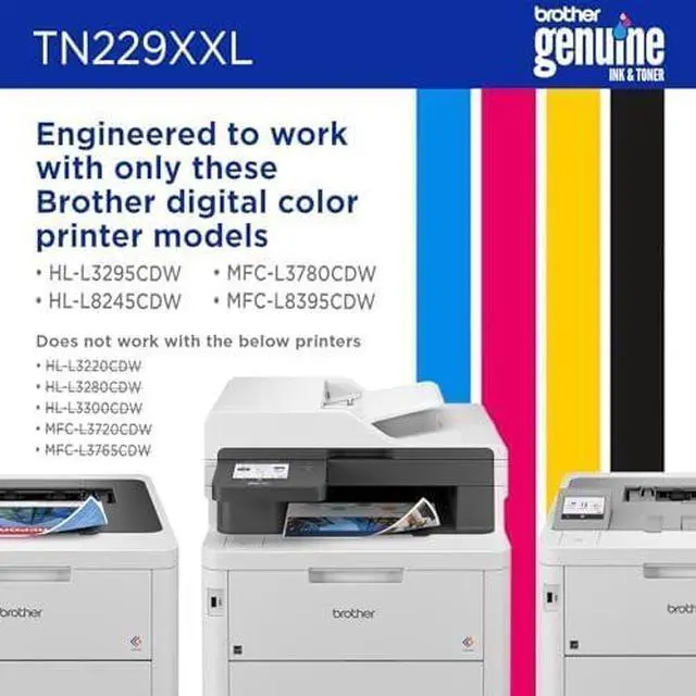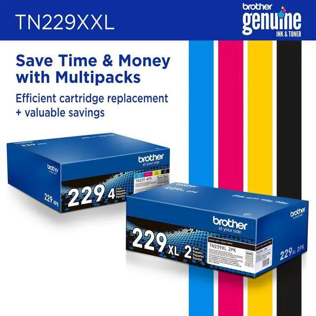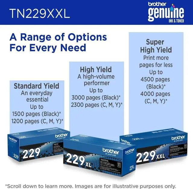 Print confidently in high-volume environments with Brother Genuine TN229XXLM Super High Yield Magenta Toner Cartridges. They offer deep savings per page costs, consistently sharp tones, laser-quality prints, and page yields up to 4,000 pages.