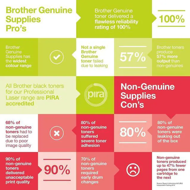 Though cheap, non-branded refill cartridges are widely available, theyre simply not as compatible with your Brother printer. This can lead to issues with both printout quality and your machines performance and these problems can sometimes prove costly to put right.