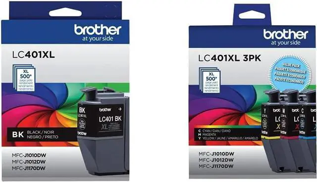 Trust Brother Genuine ink for superior inkjet print quality and performance you can consistently rely on. Brother Genuine LC401XL 3PK High Yield Color Ink Cartridges deliver consistent, professional print quality and ultra convenience you can count on for up to 500 pages per cartridge.(1) Brother Genuine ink is intelligently engineered to work seamlessly with your Brother inkjet printer to consistently produce sharp prints that withstand the test of time. This 3-pack contains one cartridge each of Cyan, Magenta and Yellow ink. Brother Genuine LC401XL 3PK provides the ultimate in convenience giving you the option to get all three ink colors for your Brother inkjet printer at once. A full range of single and multi-pack color and black ink cartridges is available that delivers high quality prints, reliable page yields and exceptional value. Brother Genuine LC401XL 3PK ink cartridges are for use with Brother affordable color inkjet all-in-one printers MFC-J1010DW, MFC-J1012DW and MFC-J1170DW. Brother offers an environmentally responsible way for customers to dispose of Brother Genuine cartridges at end of life. Visit manufacturers website for information. Disclaimer: (1) Approximate page yields in accordance with ISO/IEC 24711. For additional page yield info, see manufacturers website.