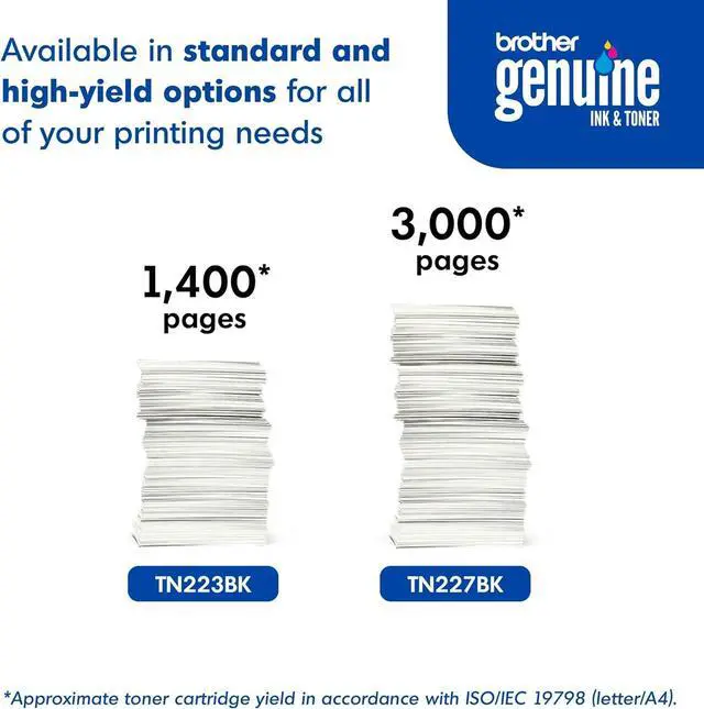 DELIVERS SUPERIOR LASER PRINT QUALITY. Brother Genuine TN-227BK high yield black toner cartridge delivers consistent, crisp, professional laser quality output you can rely on for up to 3,000-pages.
