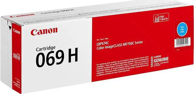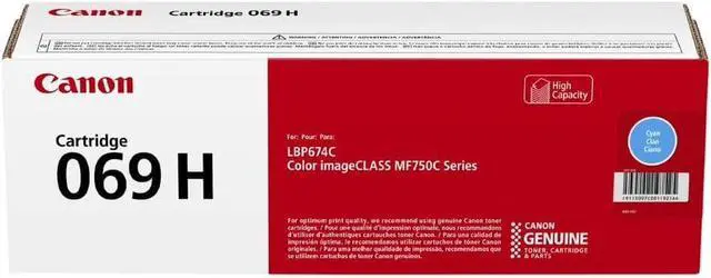 Canon Genuine Toner 069 / 069 H works with LBP674Cdw, MF753Cdw and MF751Cdw laser printers. Toner 069 CMY yields up to 1,900 pages, Black yields up to 2,100 pages, and 069 High Capacity CMY yields up to 5,500 pages, Black yields up to 7,600 pages (ISO / IEC Standard).