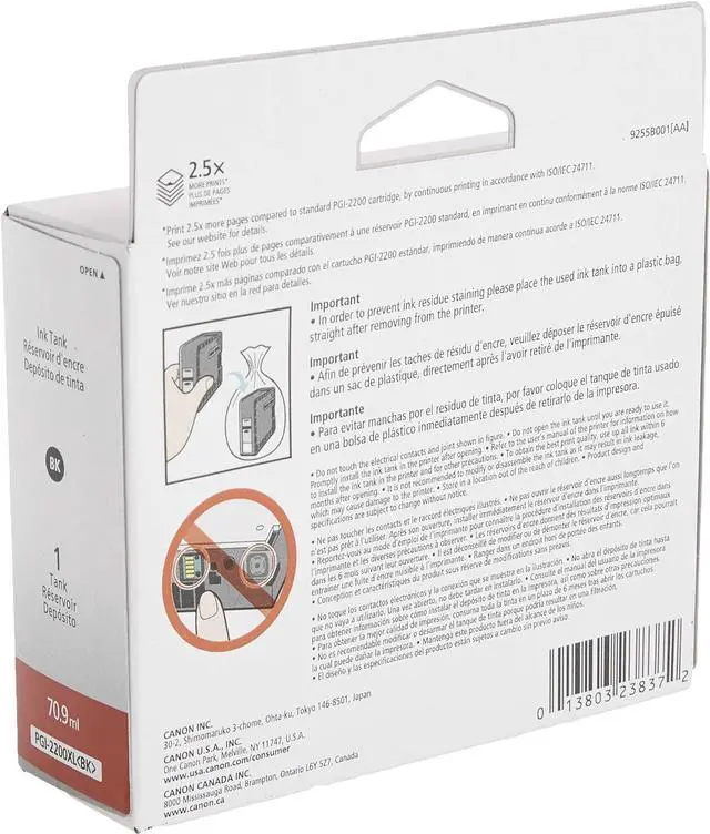 Get high-quality results from Canon PGI-2200 Ink Cartridges. Durable inks produce text and images that are smudge-proof and highlighter resistant so it's easy to mark up documents as needed, and the extra-large format yields 2,500 pages to maximize uptime from each tank. This Canon 2200 XL ink tank fits into compatible Canon MAXIFY printers seamlessly thanks to the high-precision manufacturing processes.