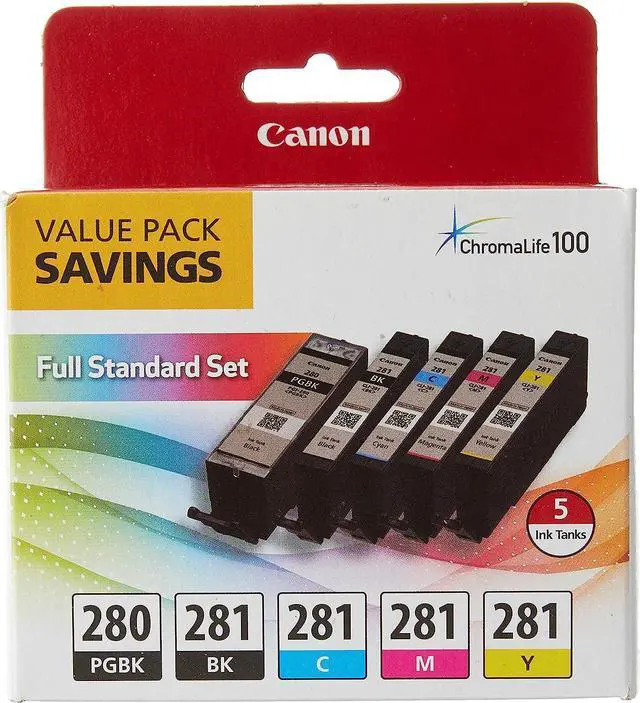 This value pack includes PGI-280 Pigment Black ink for your text documents, and a set of CLI-281dye-based inks for printing great looking photos and images.