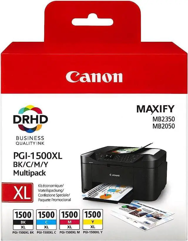 Canon PGI-1500XL C/M/Y/BK. Cartouche d'impression, couleurs: Noir, Cyan, Magenta, Jaune, Produits compatibles: Canon MAXIFY MB2050, Technologie d'impression: Jet d'encre Économisez du temps et de l'argent avec ce multipack contenant un ensemble complet d'encres XL pour votre imprimante : cyan, magenta, jaune et noir. Les encres pigmentées DRHD produisent des documents d'entreprise de qualité professionnelle, page après page.