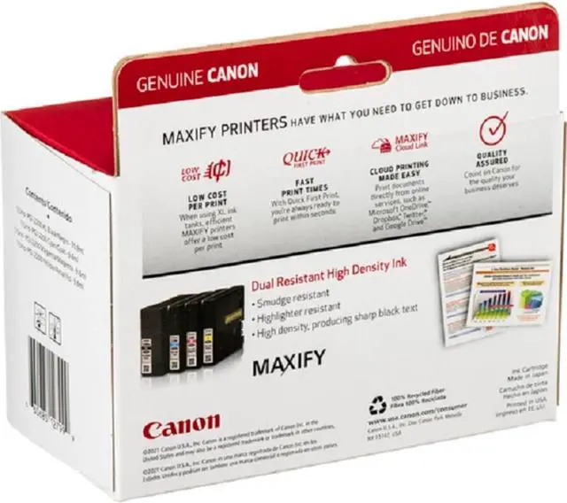 Print vivid documents and photos in smudge-free pigment with this 4-pack of ink dispensers. This collection of ink includes a black cartridge that delivers up to 2500 pages, as well as cyan, magenta and yellow cartridges that print up to 1500 pages each. This Canon ink pack is compatible with select Canon printers for clear images and text with every print.
