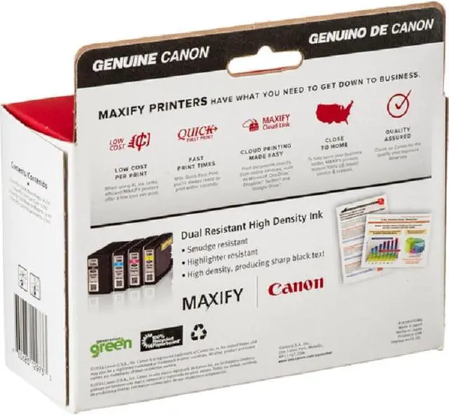 Keep your Canon MAXIFY printer ready for use with this 4-pack of high yield black and standard color ink tanks. The pigment-based ink creates crisp, detailed text, stunning graphics and bold lines. These Canon ink tanks are ready to take on large printing tasks.