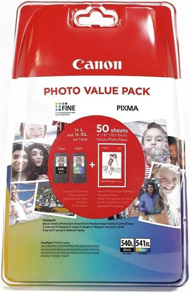 Canon PG-540L/CL-541XL Pack of PG-540L plus CL-541XK plus 50 Sheets Photo Paper 10x15 (Secure Blister Packaging).