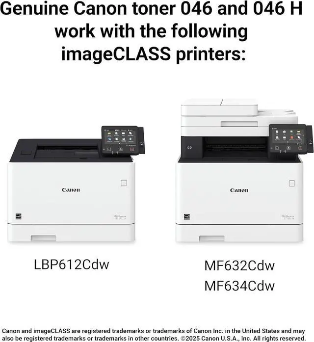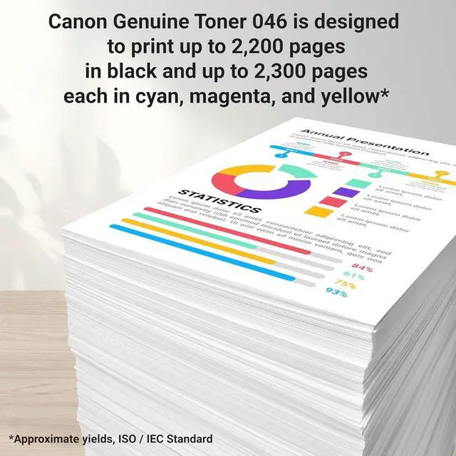 Designed by Canon engineers and manufactured in Canon facilities, GENUINE supplies are developed using precise specifications, so you can be confident that your Canon device will produce high-quality results consistently. Hi-Capacity toner options keep up with your busy printing needs, so you have less replacement efforts and more time. The Single-Cartridge System combines the toner and drum into the same unit, which means you only have one consumable to replace. The MF730 series and the LBP654Cdw use Canon Genuine Toner, Cartridge 046 CMYK (CMY yields 2,300 sheets/K yields 2,200 sheets) and Cartridge 046 Hi Capacity CMYK (CMY yields 5,000 sheets/K yields 6,300 sheets).
