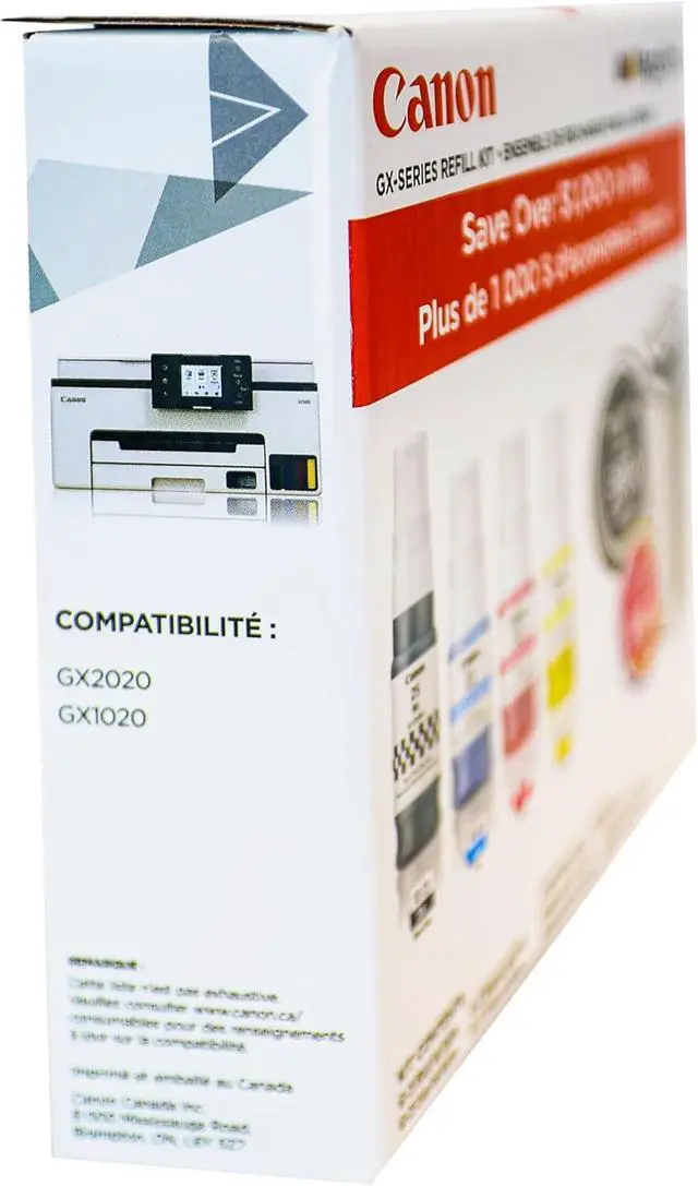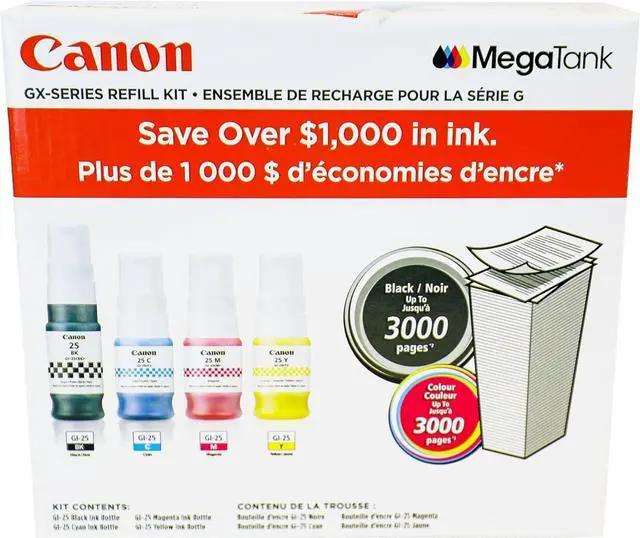 GI-25 GX-Series Refill Kit High page yields up to 3,000 pages per black ink bottle or using combination of the CMY colours Ink Volume 67.0 ml (Black) / 37.0 ml (Cyan, Magenta, Yellow) For use with MAXIFY GX1020 and GX2020 MegaTank printers.