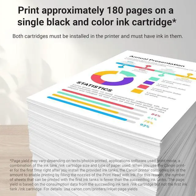 Canon Genuine Inks provide peak performance that is specifically designed for compatible Canon printers. The PG black ink cartridge produces crisp, sharp black text for your documents and the CL color cartridge produces accurate impressive color photos.