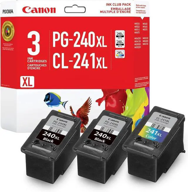 High-Yield Value Pack (3 Count) - Includes two PG-240XL Black cartridges and one CL-241XL Colour cartridge. PG-240XL Black yields up to 300 pages and CL-241XL Colour yields up to 400 pages (mixed text and graphic documents), helping reduce frequent replacements.