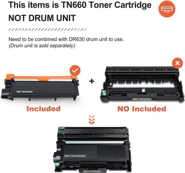 V4INK V3 Compatible TN-660 Toner Cartridge Replacement for Brother TN660 TN630 Toner Cartridge 2PK for Brother DCP-L2520DW DCP-L2540DW; HL-L2300D HL-L2305W HL-L2315DW HL-L2320D HL-L2340DW HL-L2360DW HL-L2360DN HL-L2380DW HL-L2365DW; MFC-L2680W MFC-L2685DW MFC-L2700DW MFC-L2700DN MFC-L2705DW MFC-L2707DW MFC-L2720DW MFC-L2740DW Printer. V4INK Version 3 is special own-patent designed for brother TN660 printers, under OEM manufactured standard, with up-graded black toner, never hurt and will work perfectly with your printer. Includes 2PK v4ink TN660 black compatible high yield toner cartridge and 1 User Guide, with 2,600 page yield per cartridge based on 5% coverage (letter/A4). Please noted that our TN660 toners should work with drum DR630 of v4ink and OEM. 4-Step easy installation, sharp text, bold blacks and crisp graphics as OEM standard.