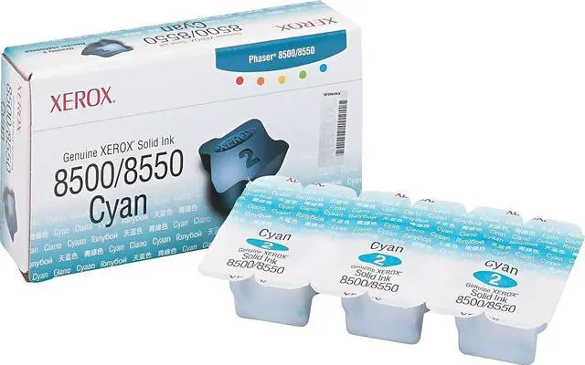 Consumable Type: Solid Ink| Printer Technology: Solid Ink| Output Color: Cyan| Printer Compatibility: Phaser 8500/8550| Yield: 3,000 pages| Features: 3 / Box; Xerox Corporation; 3 x Solid Ink Stick; Supply capacities are based on 5% coverage on an A4-size page