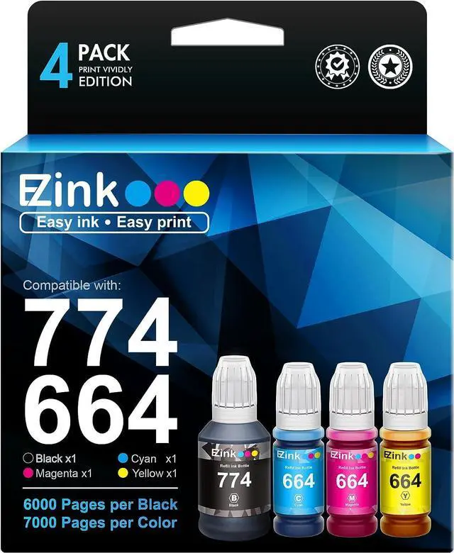 4.7 out of 5 starsE-Z Ink (TM) Compatible Ink Bottle Replacement for Epson 774 664 T774 T664 High Yield to use with ET-2650, ET-16500, ET-4500, ET-2550, ET-3600, ET-2600, ET-4550 (Black, Cyan, Magenta, Yellow, 4 Pack