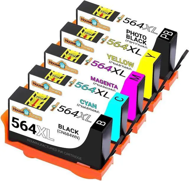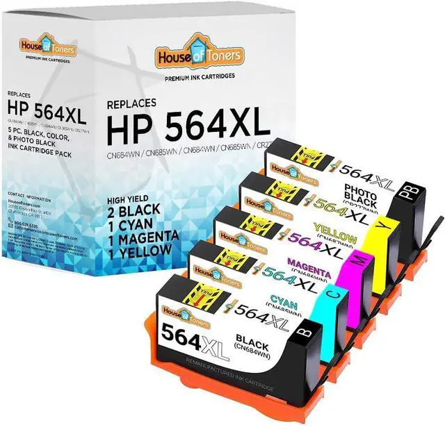 5 Pack Remanufactured HP 564XL New Generation Inkjet Cartridges 1-HP CN684WN - Remanufactured in USA Black Yields 550 Pgs 1-HP CN685WN Cyan Yields 750 Pgs 1-HP CN686WN Magenta Yields 750 Pgs 1-HP CN687WN Yellow Yields 750 Pgs 1-HP CR277WN Photo Black Yields 290 Pgs *This pack contains a PHOTO black which goes in printers with (5) cartridge slots.* For use in the following printers: Photosmart Series: 7510 / 7515 / 7520 / 7525 / B8500 / B8550 / B8553 / B8558 / C309 / C309a / C309g / C310 / C410a / C410b / C410e / C510 / C510a / C5300 / C5324 / C5370 / C5373 / C5380 / C5383 / C5388 / C5390 / C5393 / C6300 / C6324 / C6340 / C6350 / C6375 / C6380 / C6383 / C6388 / D5400 / D5445 / D5460 / D5463 / D5468 / D7500 / D7560 / Photosmart eStation / Photosmart Premium / Photosmart Premium AIO / Photosmart Premium Fax / Photosmart TouchSmart.
