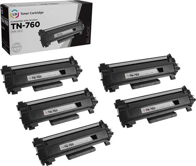 Save and print even more with our compatible replacements for Brother TN760 / TN730 toner! This offer includes 5 compatible replacements for Brother TN-760 black toner cartridges; they replace the lower yield TN730 toner for Brother printer. Why pay twice as much for expensive brand name toner TN-730/TN-760 when our compatible replacements are backed by a 100% satisfaction and lifetime guarantee? Compatible with DCP-L2550DW, HL-L2325DW, HL-L2350DW, HL-L2370DW, HL-L2370DW XL, HL-L2390DW, HL-L2395DW, MFC-L2690DW, MFC-L2710DW, MFC-L2717DW, MFC-L2730DW, MFC-L2750DW, MFC-L2750DW XL laser printers. Please note, retail packaging may vary, and these cartridges will only work with printers purchased within the United States and Canada. The use of replacement Brother toner TN760 and supplies does not void your printers warranty. Professionally manufactured by LD Products. Brother is a registered trademark of Brother Industries, Ltd. and is not affiliated with and does not endorse LD Products.