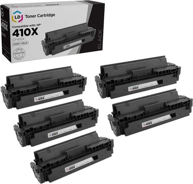 Save and print even more when you shop with LD Products! Item Inclusions: Compatible Toner Cartridge Replacement for HP 410X CF410X High Yield (Black, 5-Pack). Why pay twice as much for brand name HP 410X cartridge when our Compatible printer supplies deliver excellent quality results for a fraction of the price? Our Compatible cartridges for Hewlett-Packard are backed by a 100% Satisfaction and Lifetime Guarantee. So stock up now and save even more! This is a remanufactured cartridge and it was not manufactured by HP. This set works in the following HP Color LaserJet Pro MFP M477fdn M477fdw, M477fnw, M452dn, M452dw and M452nww. Enjoy the best prices on our top-rated toner cartridge replacements. Repeat Customers LOVE our printer cartridges! Take advantage of even bigger savings when you shop high yieldtoner cartridges that allow you to print more pages. Keep printing longer for a lower price with our HP Compatible toner cartridges. We offer printer cartridges for hard-to-find printer models.Shop on a lower price for this popular brand.Pay lower prices for replacements for this popular brand. Our cartridges are good forhome, office or when you're running a business.Our products are put through a rigorous testing process wherethey are monitored for quality and reliability. Knowing thetoner cartridge that worksmost efficiently with your printer model can save you a ton of money in the long run. Please note, retail packaging may vary and these cartridges will only work with printers purchased within the United States and Canada. The use of compatible cartridges does not void your printers warranty and our cartridges are not manufactured by HP. We are the exclusive reseller of LD Products brand of high-quality printing supplies.