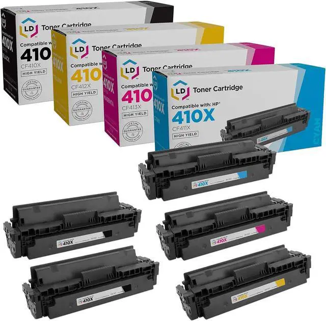 Save and print even more when you shop with LD Products! Item Inclusions: Compatible Toner Cartridge Replacement for HP 410X High Yield (2 Black, 1 Cyan, 1 Magenta, 1 Yellow, 5PK). Why pay twice as much for brand name HP 410X cartridge when our Compatible printer supplies deliver excellent quality results for a fraction of the price? Our Compatible cartridges for Hewlett-Packard are backed by a 100% Satisfaction and Lifetime Guarantee. So stock up now and save even more! This is a remanufactured cartridge and it was not manufactured by HP. This set works in the following HP Color LaserJet Pro MFP M477fdn M477fdw, M477fnw, M452dn, M452dw and M452nww. Enjoy the best prices on our top-rated toner cartridge replacements. Repeat Customers LOVE our printer cartridges! Take advantage of even bigger savings when you shop high yieldtoner cartridges that allow you to print more pages. Keep printing longer for a lower price with our HP Compatible toner cartridges. We offer printer cartridges for hard-to-find printer models.Shop on a lower price for this popular brand.Pay lower prices for replacements for this popular brand. Our cartridges are good forhome, office or when you're running a business.Our products are put through a rigorous testing process wherethey are monitored for quality and reliability. Knowing thetoner cartridge that worksmost efficiently with your printer model can save you a ton of money in the long run. Please note, retail packaging may vary and these cartridges will only work with printers purchased within the United States and Canada. The use of compatible cartridges does not void your printers warranty and our cartridges are not manufactured by HP. We are the exclusive reseller of LD Products brand of high-quality printing supplies.