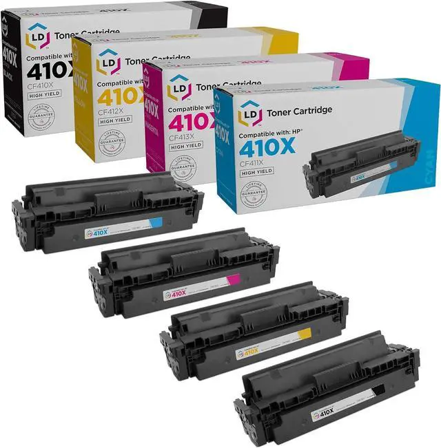 Save and print even more when you shop with LD Products! Item Inclusions: Compatible Toner Cartridge Replacements for HP 410X High Yield (1 Black, 1 Cyan, 1 Magenta, 1 Yellow, 4PK). Why pay twice as much for brand name HP 410X cartridge when our Compatible printer supplies deliver excellent quality results for a fraction of the price? Our Compatible cartridges for Hewlett-Packard are backed by a 100% Satisfaction and Lifetime Guarantee. So stock up now and save even more! This is a remanufactured cartridge and it was not manufactured by HP. This set works in the following HP Color LaserJet Pro MFP M477fdn M477fdw, M477fnw, M452dn, M452dw and M452nww. Enjoy the best prices on our top-rated toner cartridge replacements. Repeat Customers LOVE our printer cartridges! Take advantage of even bigger savings when you shop high yieldtoner cartridges that allow you to print more pages. Keep printing longer for a lower price with our HP Compatible toner cartridges. We offer printer cartridges for hard-to-find printer models.Shop on a lower price for this popular brand.Pay lower prices for replacements for this popular brand. Our cartridges are good forhome, office or when you're running a business.Our products are put through a rigorous testing process wherethey are monitored for quality and reliability. Knowing thetoner cartridge that worksmost efficiently with your printer model can save you a ton of money in the long run. Please note, retail packaging may vary and these cartridges will only work with printers purchased within the United States and Canada. The use of compatible cartridges does not void your printers warranty and our cartridges are not manufactured by HP. We are the exclusive reseller of LD Products brand of high-quality printing supplies.