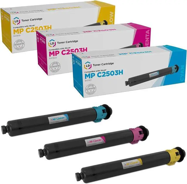 Save even more with our set of 3 compatible laser toner cartridges. This set includes 1 841921 Cyan, 1 841920 Magenta, and 1 841919 Yellow Laser Toner cartridges. Why pay twice as much for brand name Ricoh C2003/C2503 cartridge when our compatible printer supplies deliver excellent quality results for a fraction of the price? This set works in the following Ricoh Aficio printers: MP C2003, MP C2003 Plus, MP C2004, MP C2503 & MP C2504. Please note, this item will only work with printers purchased within the United States and Canada. We are the exclusive reseller of LD Products brand of high quality printing supplies.