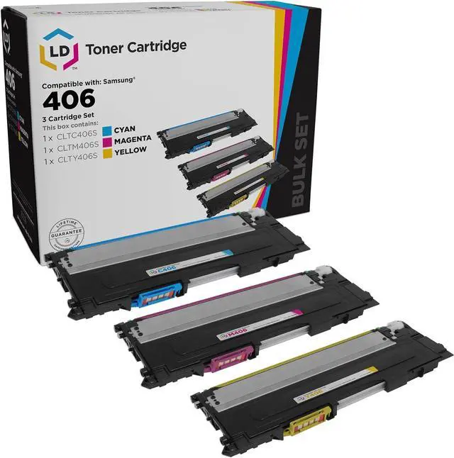 Save even more with our set of 3 compatible laser toner cartridges. This set includes 1 CLT-C406S cyan, 1 CLT-M406S magenta, and 1 CLT-Y406S yellow laser toner cartridges. Why pay twice as much for brand name Samsung CLT cartridge when our compatible printer supplies deliver excellent quality results for a fraction of the price? This set works in the following Samsung CLP, CLX, and Xpress printers: CLP-365W, CLX-3305FW, Xpress C410W, and Xpress C460FW. We are the exclusive reseller of LD Products brand of high quality printing supplies.