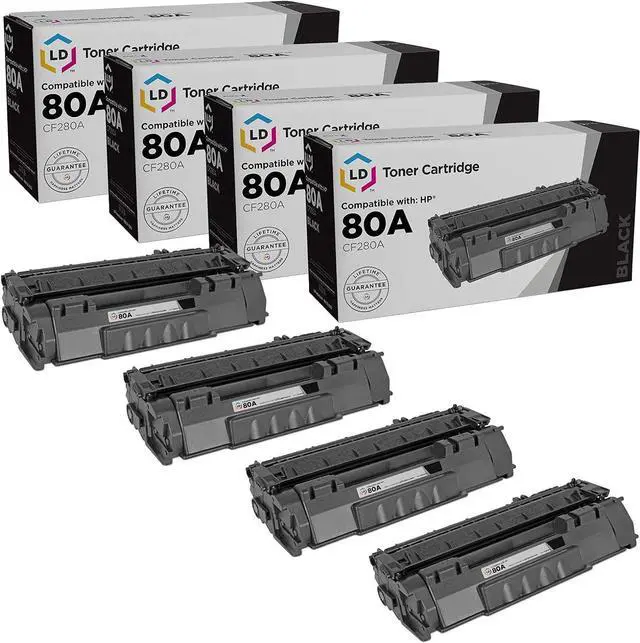 Save and print even more when you shop with LD Products! Compatible Replacements Included: 4 CF280A / HP 80A Toner Cartridge Black / Standard Yield. Why pay twice as much for brand name HP 80/A cartridge when our Compatible printer supplies deliver excellent quality results for a fraction of the price? Our Compatible cartridges for Hewlett-Packard are backed by a full 2 year 100% satisfaction guarantee. So stock up now and save even more! This is a remanufactured cartridge and it was not manufactured by HP. This set works in the following HP LaserJet / HP LaserJet Pro: 400 M401a, 400 M401dn, 400 M401dne, 400 M401dw, 400 M401n, 400 M425dn, 400 MFP M425dw. Enjoy the best prices on our top-rated toner cartridge replacements. Repeat Customers LOVE our printer cartridges! Take advantage of even bigger savings when you shop high yieldtoner cartridges that allow you to print more pages. Keep printing longer for a lower price with our HP Compatible toner cartridges. We offer printer cartridges for hard-to-find printer models.Shop on a lower price for this popular brand.Pay lower prices for replacements for this popular brand. Our cartridges are good forhome, office or when you're running a business.Our products are put through a rigorous testing process wherethey are monitored for quality and reliability. Knowing thetoner cartridge that worksmost efficiently with your printer model can save you a ton of money in the long run. Please note, retail packaging may vary and these cartridges will only work with printers purchased within the United States and Canada. The use of compatible cartridges does not void your printers warranty and our cartridges are not manufactured by HP. We are the exclusive reseller of LD Products brand of high-quality printing supplies.